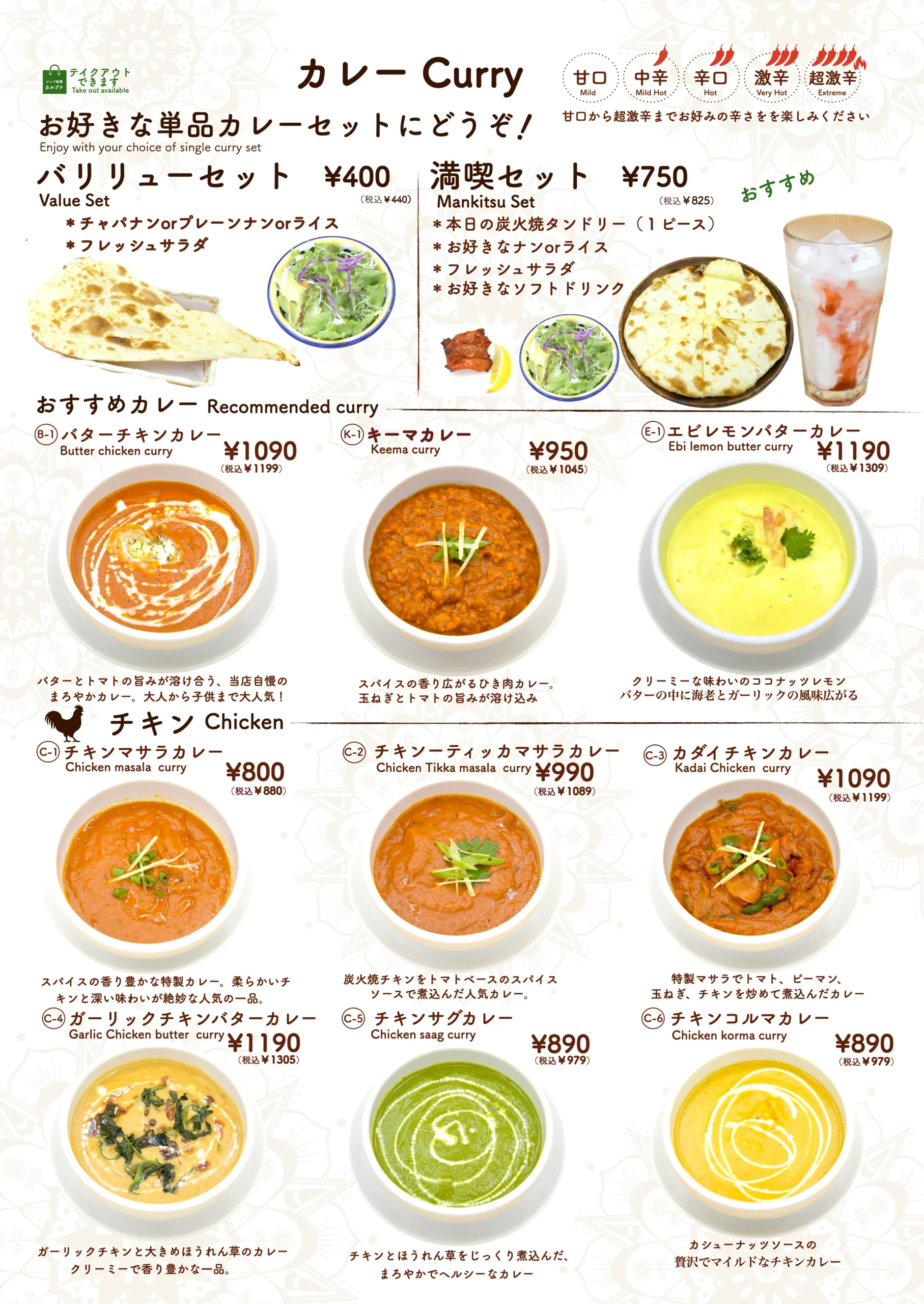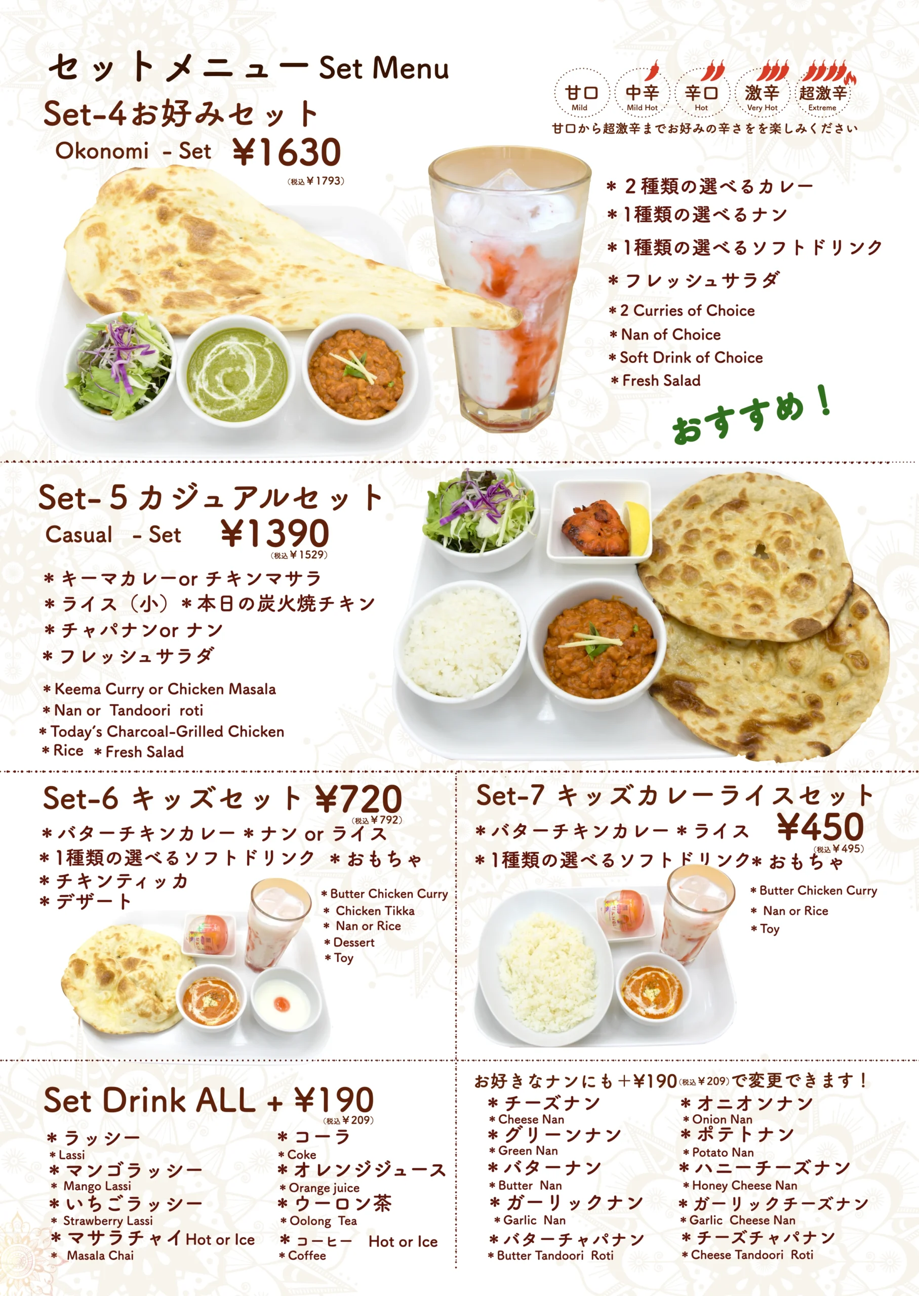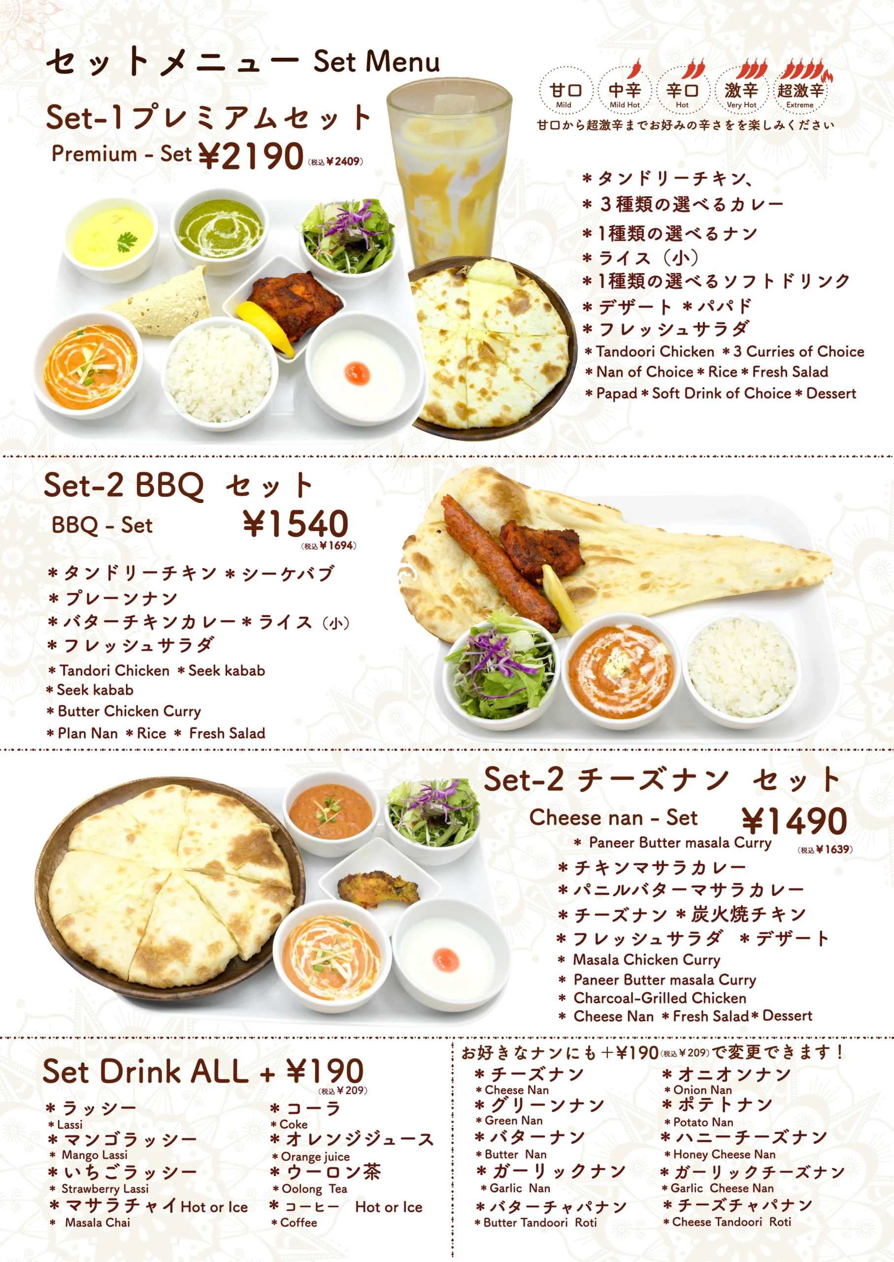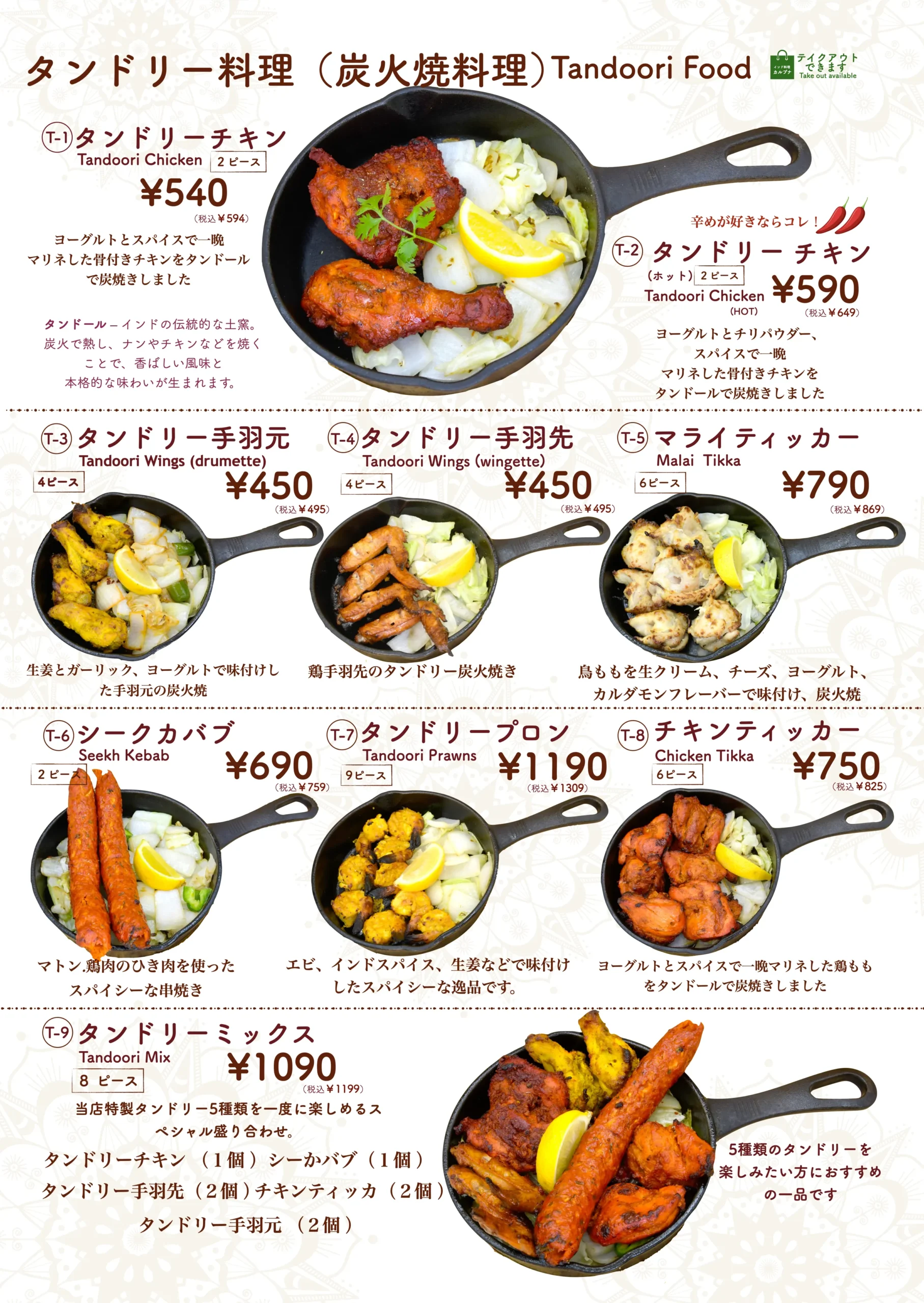タンドールメニュー「タンドリーメニューでは、スパイスに漬け込んだお肉や野菜を、専用の窯で香ばしく焼き上げています。」 カレーメニュー当店のカレーメニューでは、本格的なスパイスと新鮮な食材を使用した香り高くコクのあるインドカレーをご提供しております。 ナンメニュー当店のナンメニューでは、タンドール窯で焼き上げた、ふんわり香ばしい焼きたてナンをご提供しております。 ディナーセットメニュー完璧な夜のための特別セット ドリンクメニュー当店のドリンクメニューでは、ラッシー、ソフトドリンク、ジュース、インドのチャイなど、お食事に合う様々な飲み物をご用意しております。