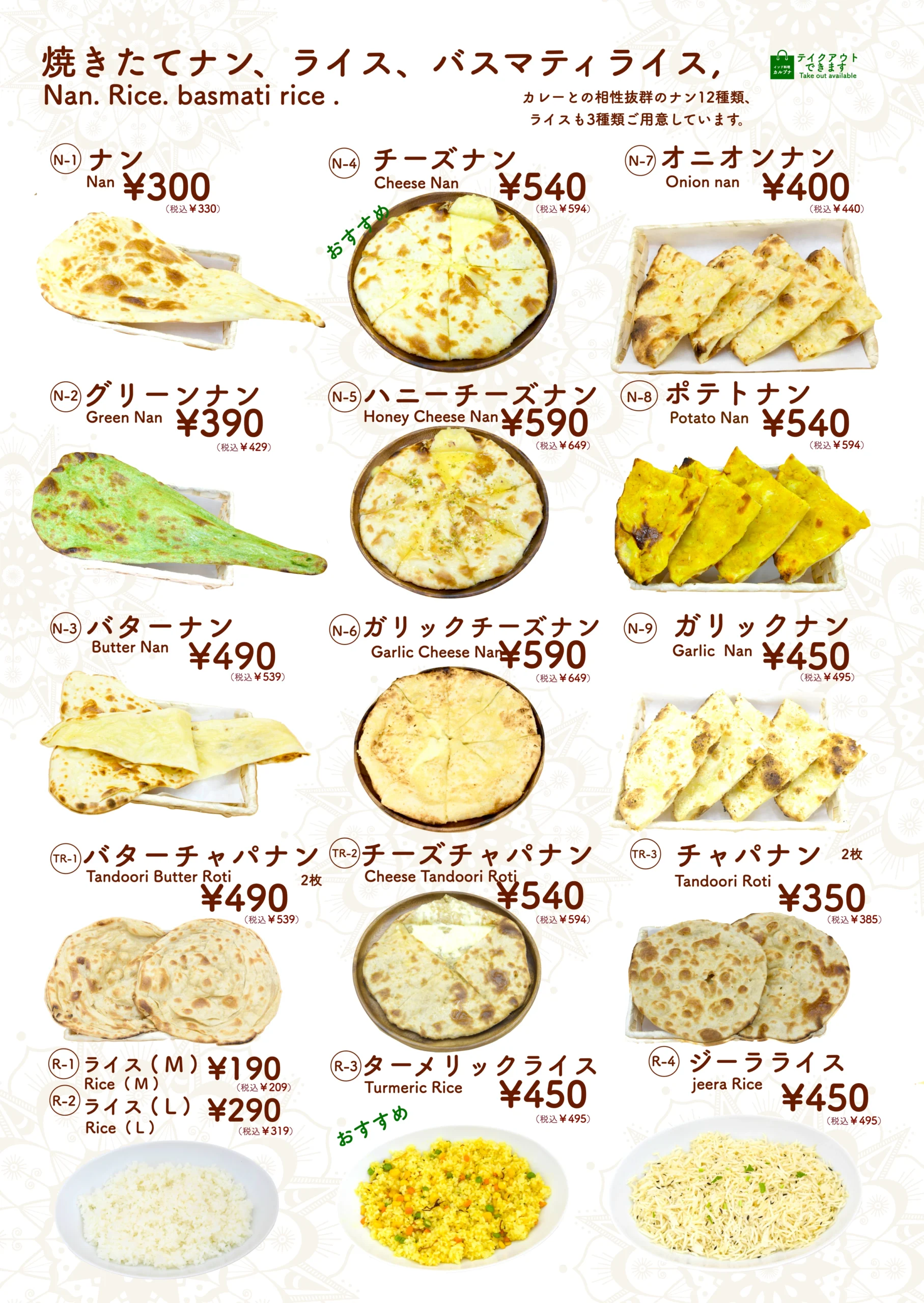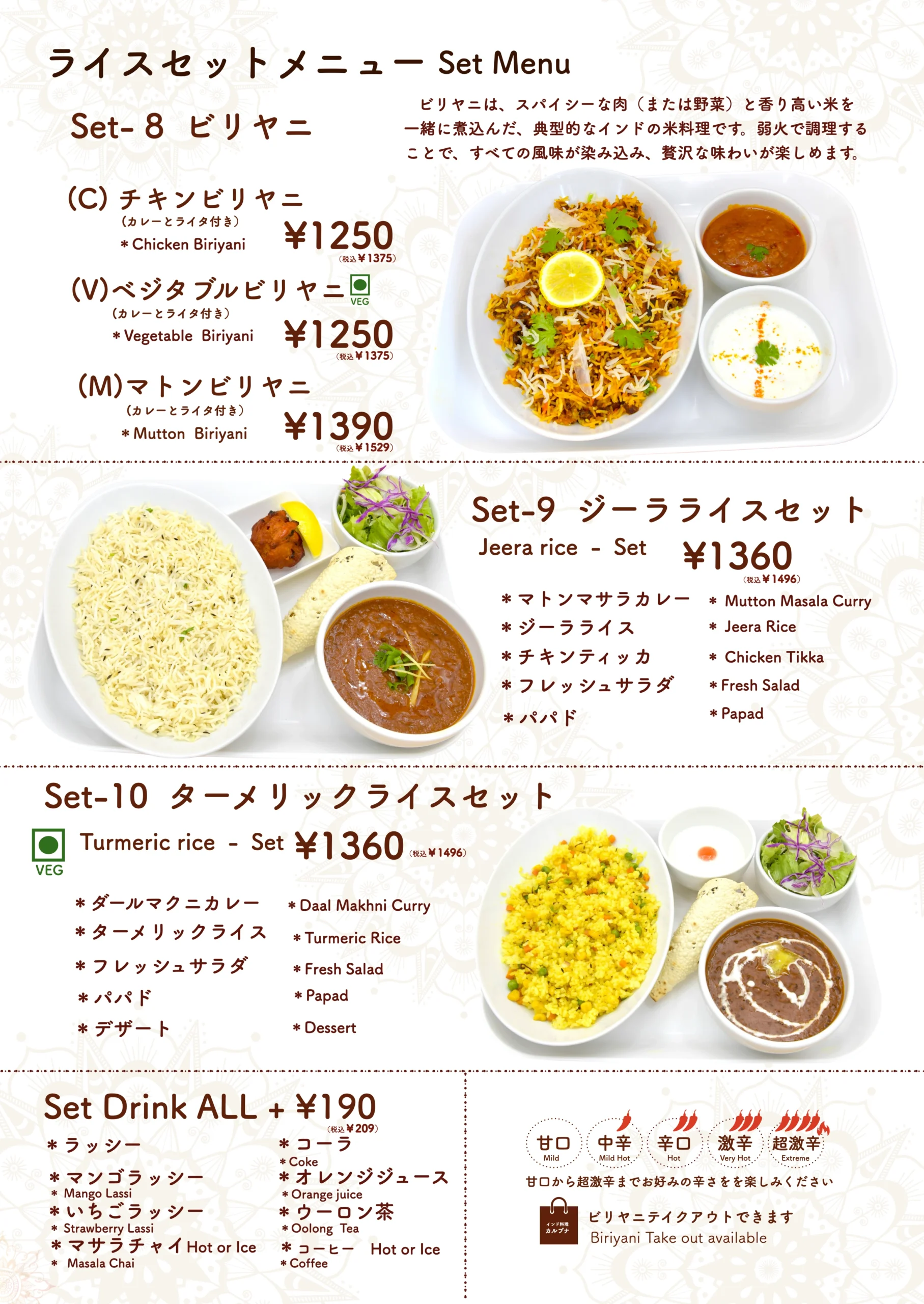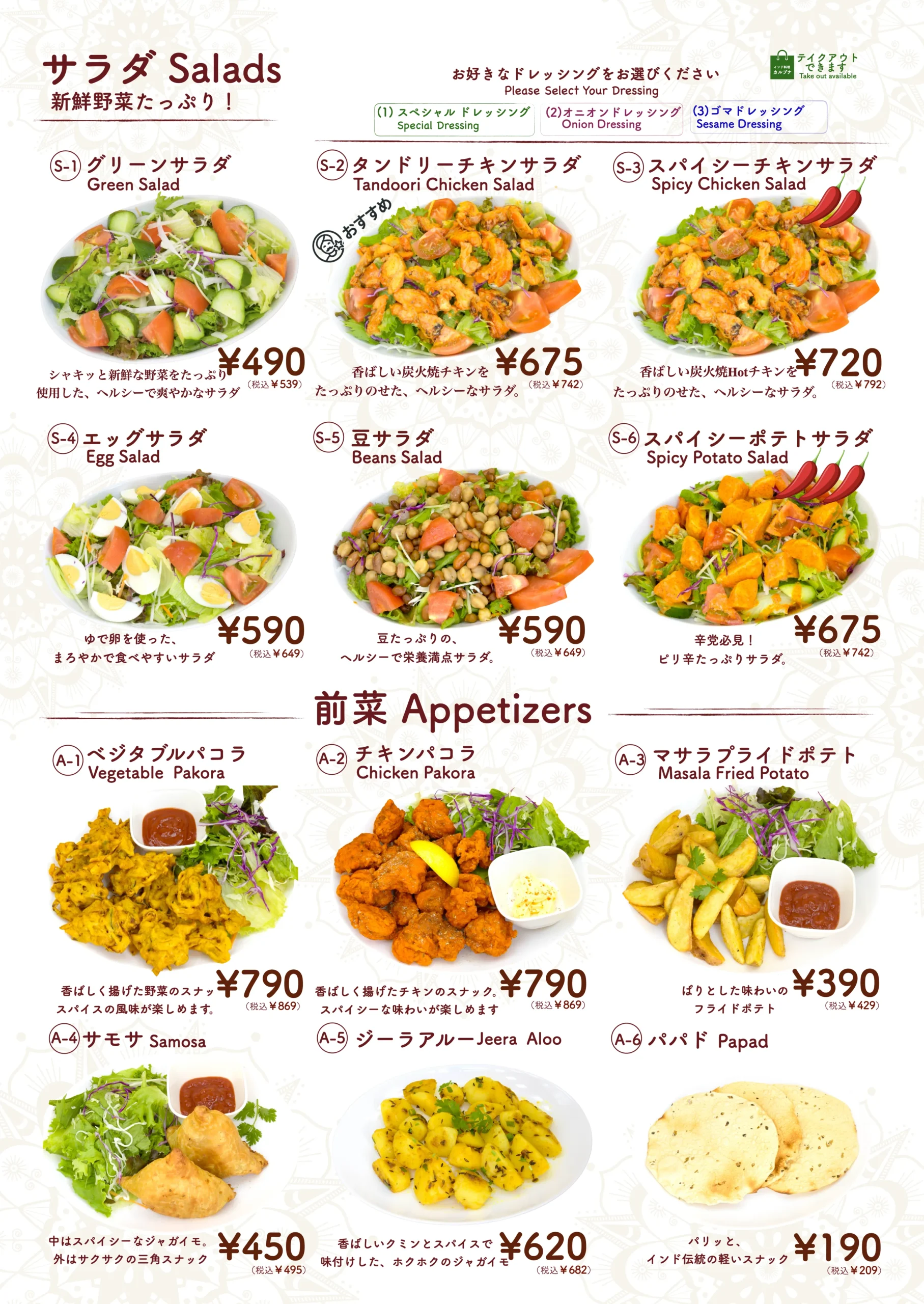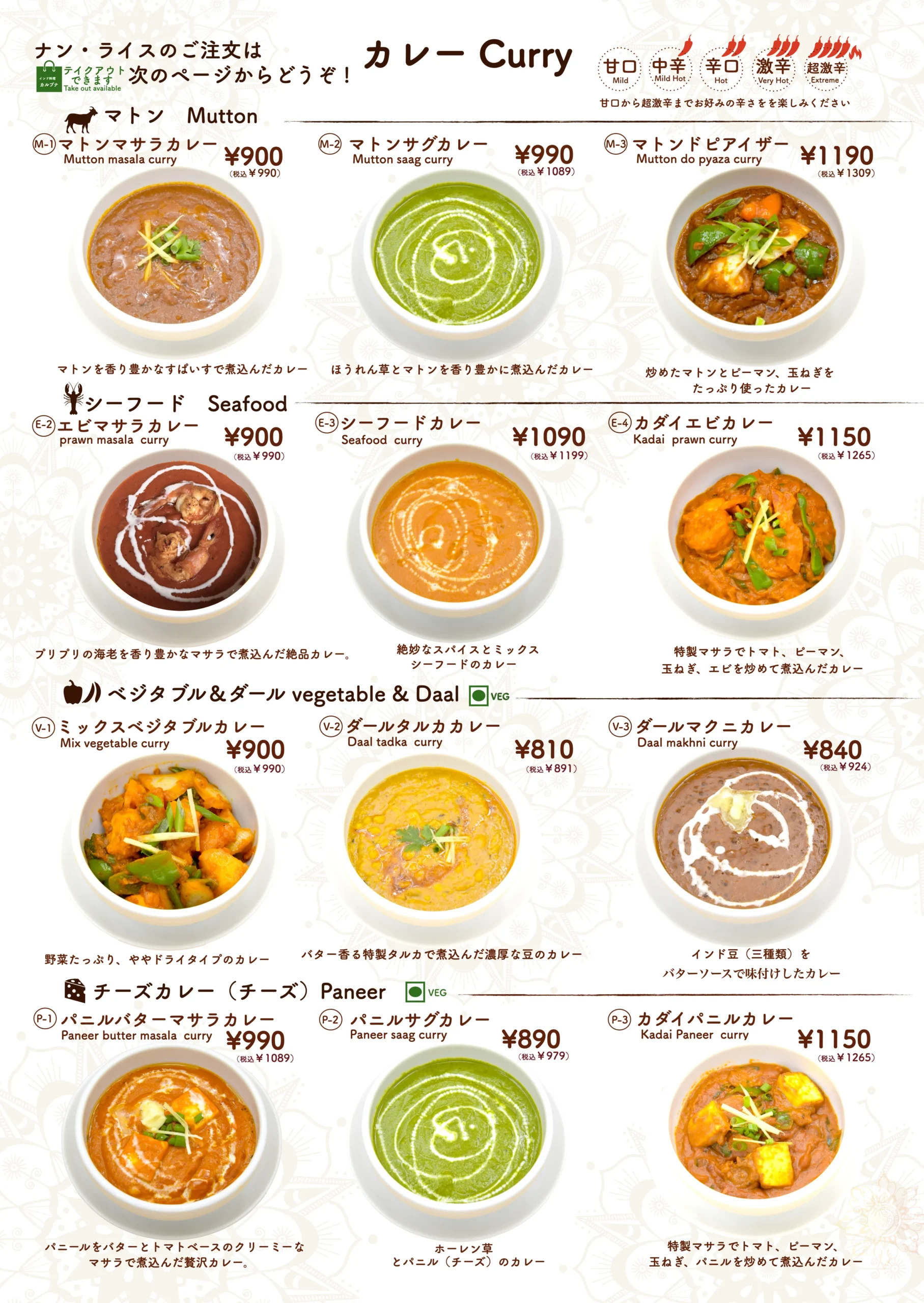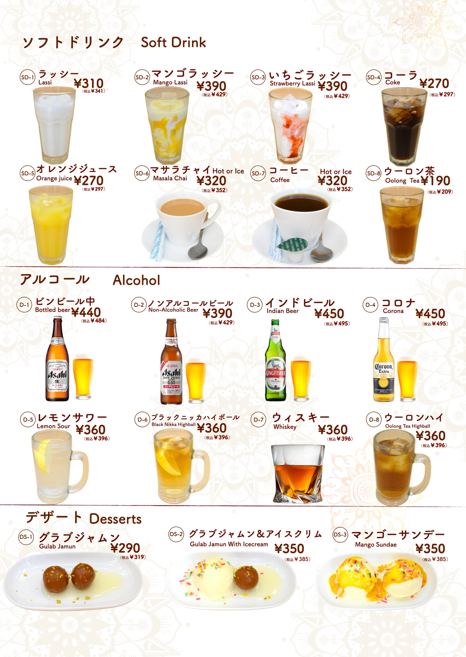タンドールメニュー「タンドリーメニューでは、スパイスに漬け込んだお肉や野菜を、専用の窯で香ばしく焼き上げています。」 カレーメニュー当店のカレーメニューでは、本格的なスパイスと新鮮な食材を使用した香り高くコクのあるインドカレーをご提供しております。 ナンメニュー当店のナンメニューでは、タンドール窯で焼き上げた、ふんわり香ばしい焼きたてナンをご提供しております。 ディナーセットメニュー完璧な夜のための特別セット ドリンクメニュー当店のドリンクメニューでは、ラッシー、ソフトドリンク、ジュース、インドのチャイなど、お食事に合う様々な飲み物をご用意しております。